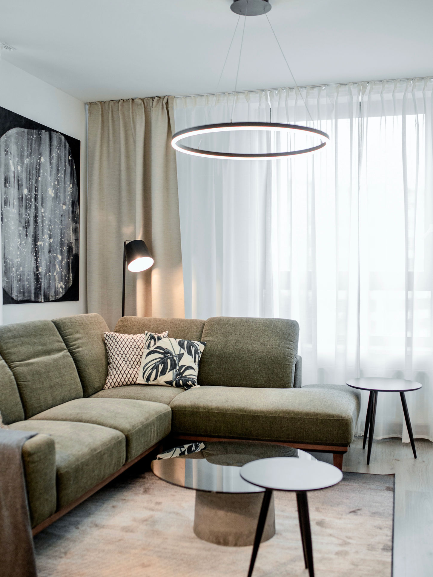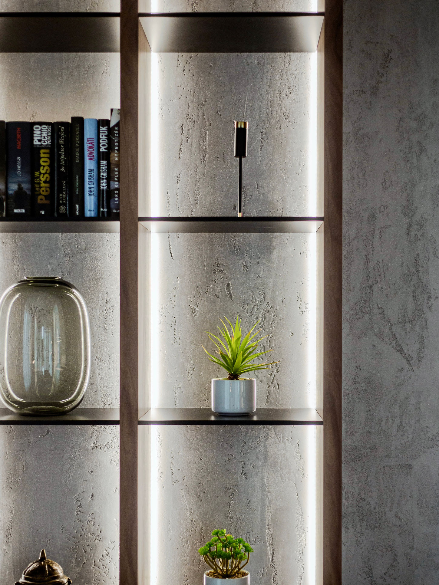 Byt pre muža sme navrhli v znamení mestskej elegancie. Orechová dyha a betónova stierka sa pekne dopĺňa s dizajnovými prvkami.