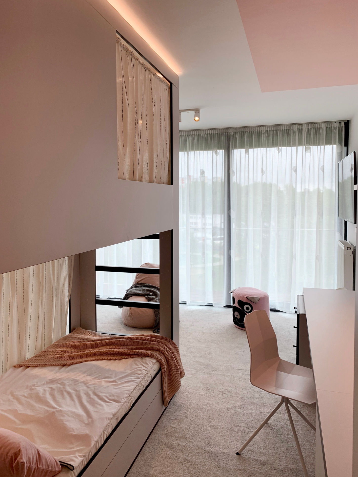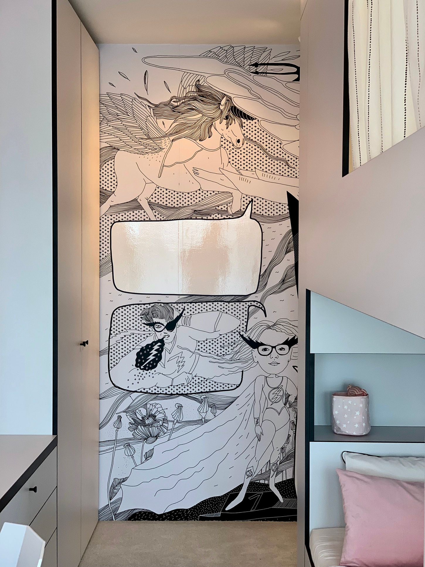 Výstrel popkultúry a komixov sa zmiešal, aby vznikla táto unikátna detská izba. Dve izby v jednej sme dosiahli umiestnením postele do stredu priestoru.